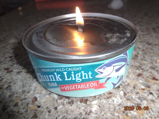 It’s an old emergency lighting device that really works. Tuna fish, or any fish or food that is packed in a can with soybean, olive or vegetable oil… can be used as an emergency candle. Don’t open the can by taking the lid off.