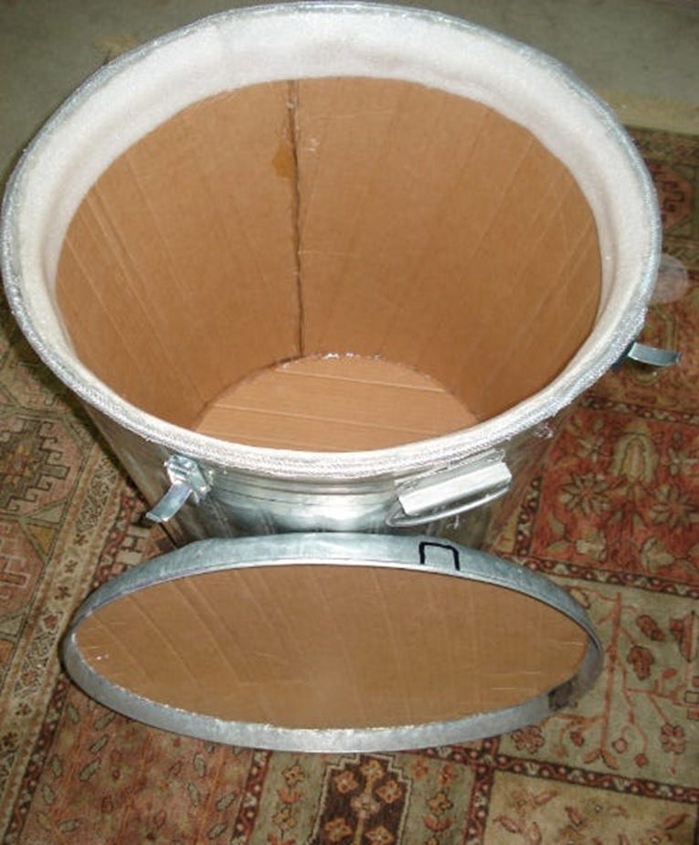 Insulating Cardboard. Visit your local hardware store and get the cardboard that a refrigerator gets shipped in or another item that gives you a large piece. The size of the piece of cardboard you need depends on the size of the metal container you use. One piece is easier to fit than two or more pieces in my experience. The height measurement of the can plus 18 inches, will suffice for the height. Measuring around the widest diameter of the can and adding 12 inches, will give you the length you will need of cardboard that you will cut to fit the can. You can use a couple of smaller pieces of cardboard if you overlap them and hot glue them in place. Hot glue any cuts or hand holds in the cardboard.