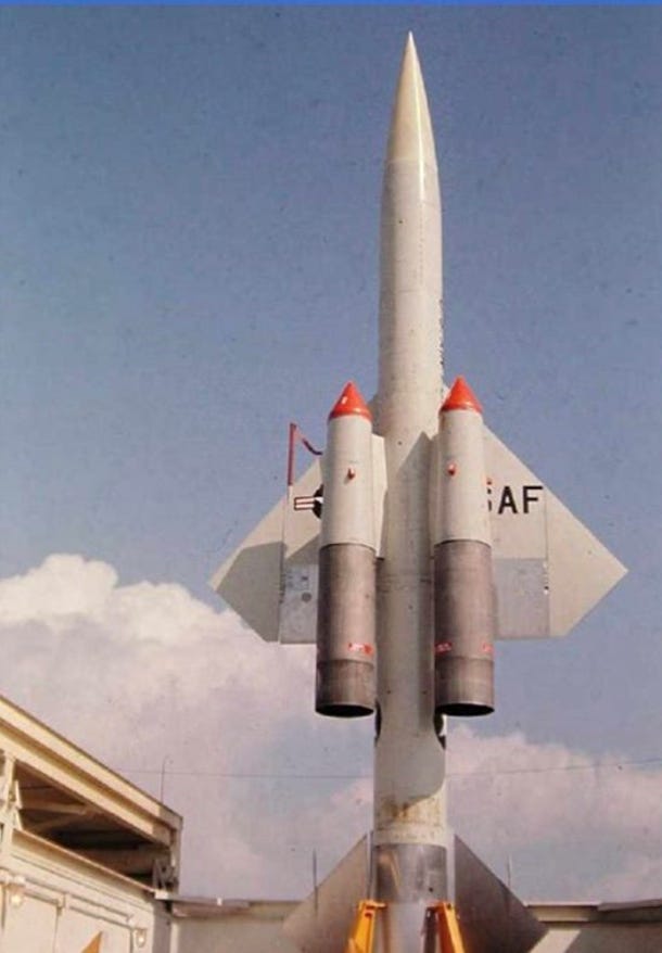 This Nuclear Bomb was a Fission/Fusion bomb… some of the old ThermoNuclear “dirty bombs.” The Hiroshima and Nagasaki bombs were “Atomic Bombs,” which was Fission only. The bomb I worked on was a Hydrogen Bomb, AKA “ThermoNuclear” bomb, the most powerful at that time and some 1,000 times more powerful than the Atom Bomb. Our missile squadron, the 74th ADMS, was part of the North American Aerospace Defense, NORAD. Our base had 28 BOMARC Nuclear tipped ground to air missiles interconnected with the NORAD system, which was the early warning system that watched the “Over the North Pole through Canada down to the United States” route the Russian bombers would take when attacking the United States. The BOMARC was designed to destroy them in the northern territories of Canada.